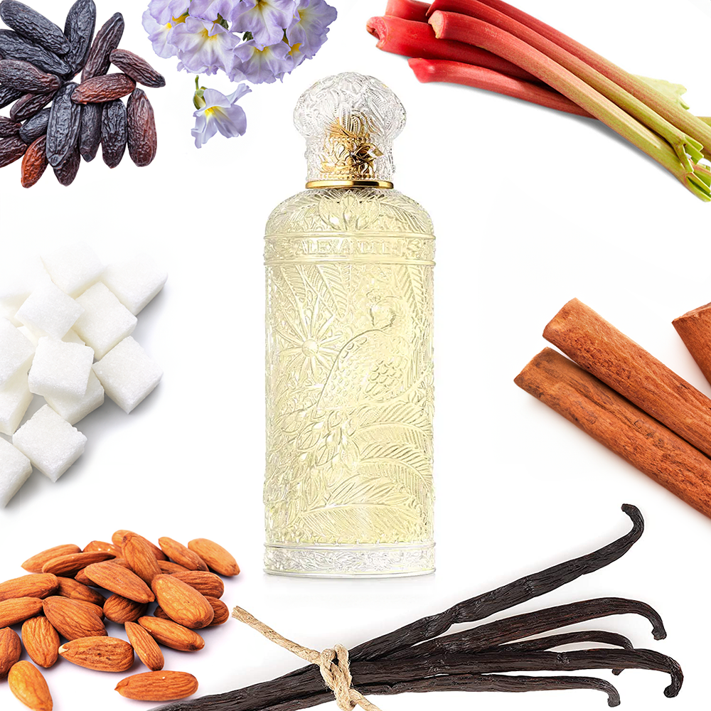 - Fragrance Notes: Rhubarb, Almond, Heliotrope, Black Vanilla Husk, Cinnamon, Tonka Bean, Sugar, Balsamic Notes, Musk.