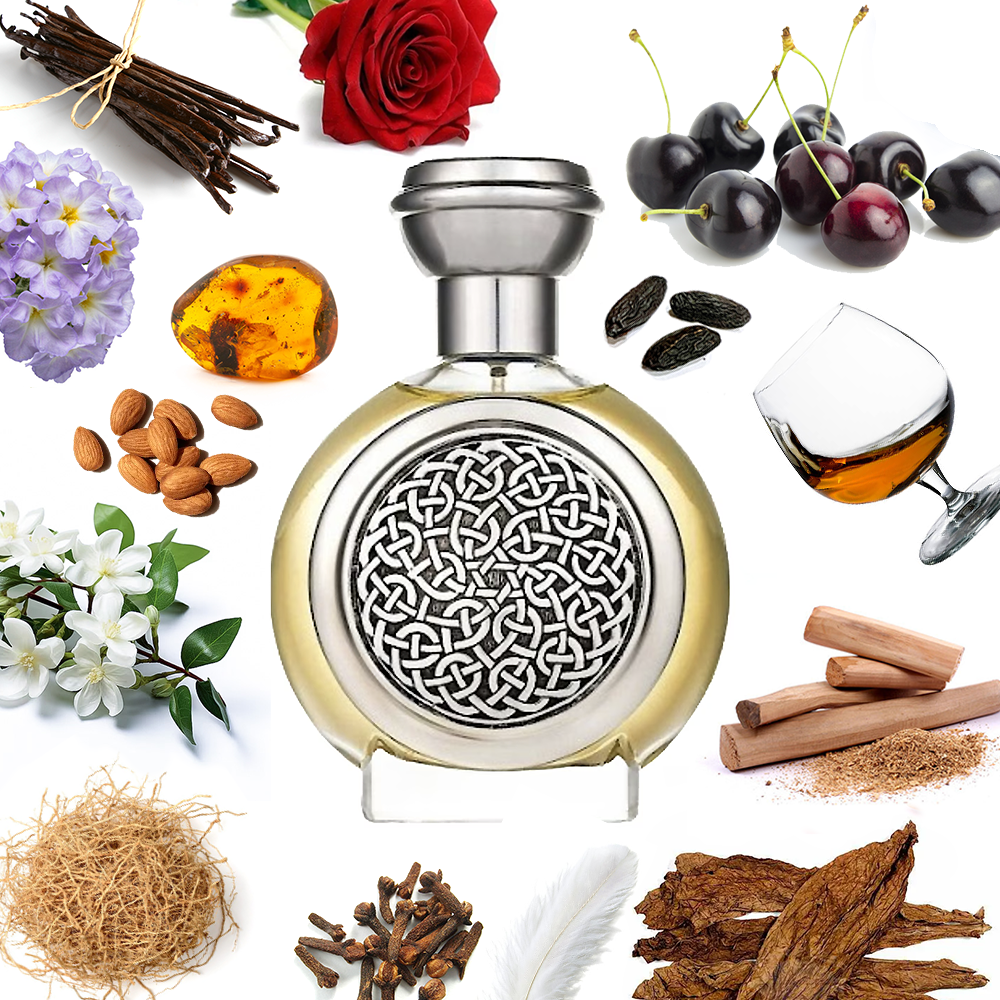 - Fragrance Notes: Cherry, Cognac, Almond, Clove, Heliotrope, Jasmine Sambac, Moroccan Rose, Tobacco, Vanilla, Tonka Bean, Amber, Sandalwood, Musk, Vetiver.