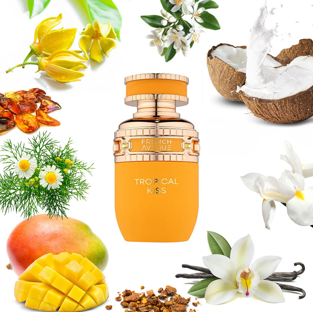 - Fragrance Notes: Chamomile, Mango, Orange Blossom, Coconut, Ylang Ylang, Orris, Vanilla, Amber, Benzoin.